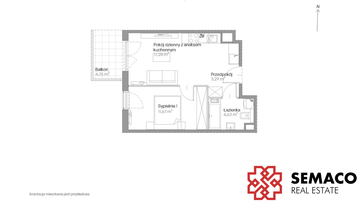 Układ: salon + aneks kuchenny, sypialnia, łazienka i przedpokój