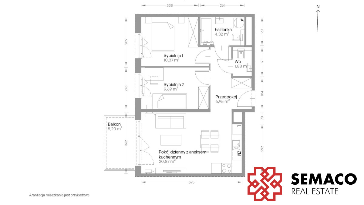 Układ: salon + aneks kuchenny, 2 sypialnie, łazienka, WC i przedpokój