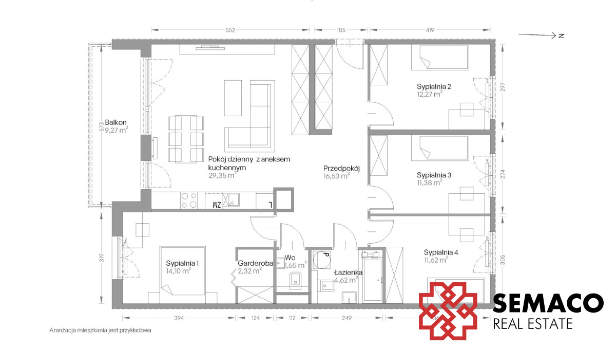 Układ: salon + aneks kuchenny, 4 sypialnie, łazienka, WC, garderoba i przedpokój