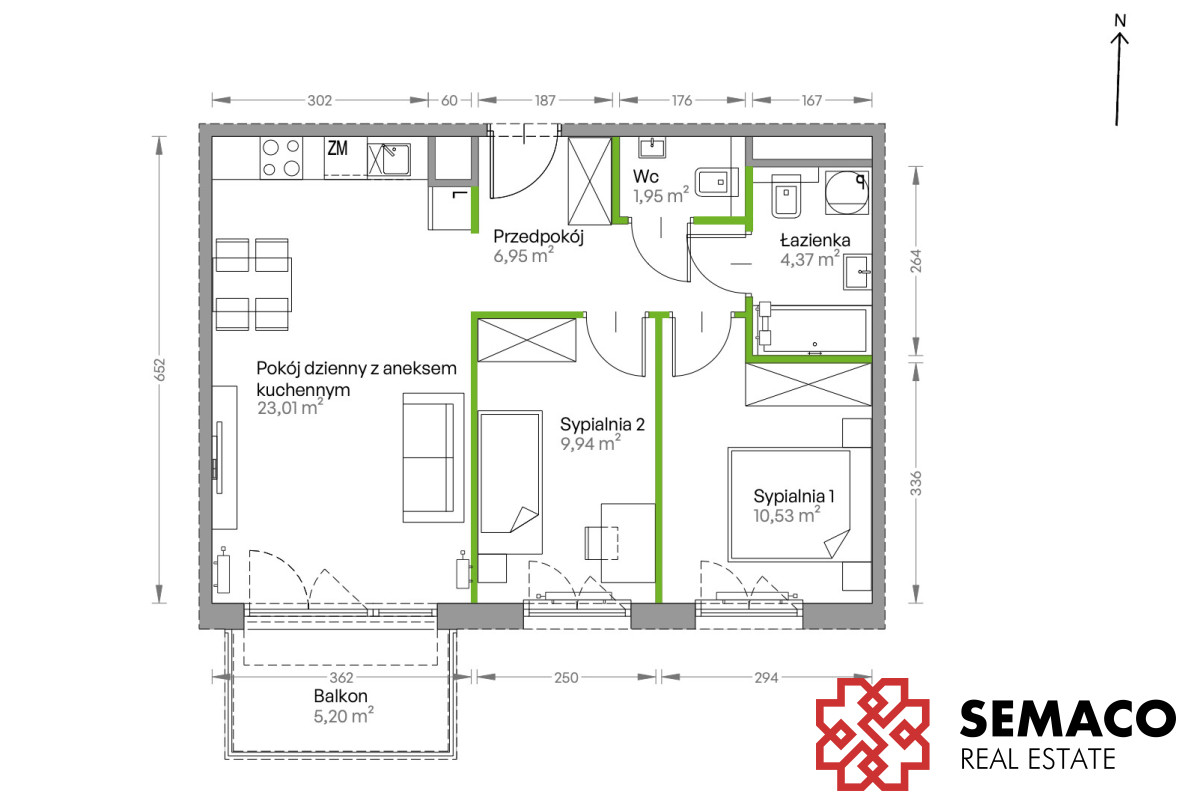 Funkcjonalny układ mieszkania: 3 pokoje, 56.75 m2.
