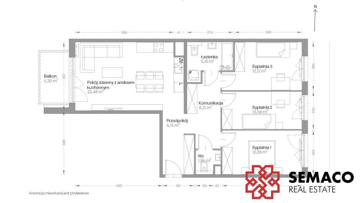 Układ: salon + aneks kuchenny, 3 sypialnie, łazienka, WC i przedpokój