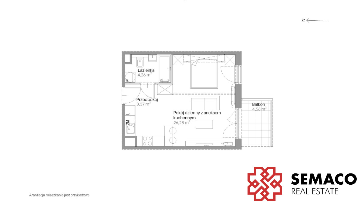 Układ: salon + aneks kuchenny, sypialnia, łazienka i przedpokój