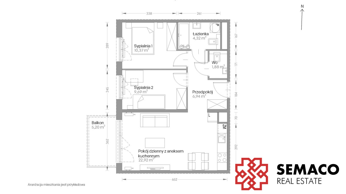 Układ: salon + aneks kuchenny, 2 sypialnie, łazienka, WC i przedpokój