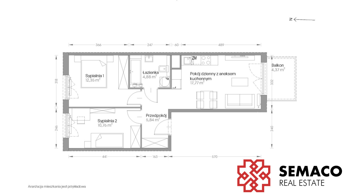 Układ: salon + aneks kuchenny, 2 sypialnie, łazienka i przedpokój
