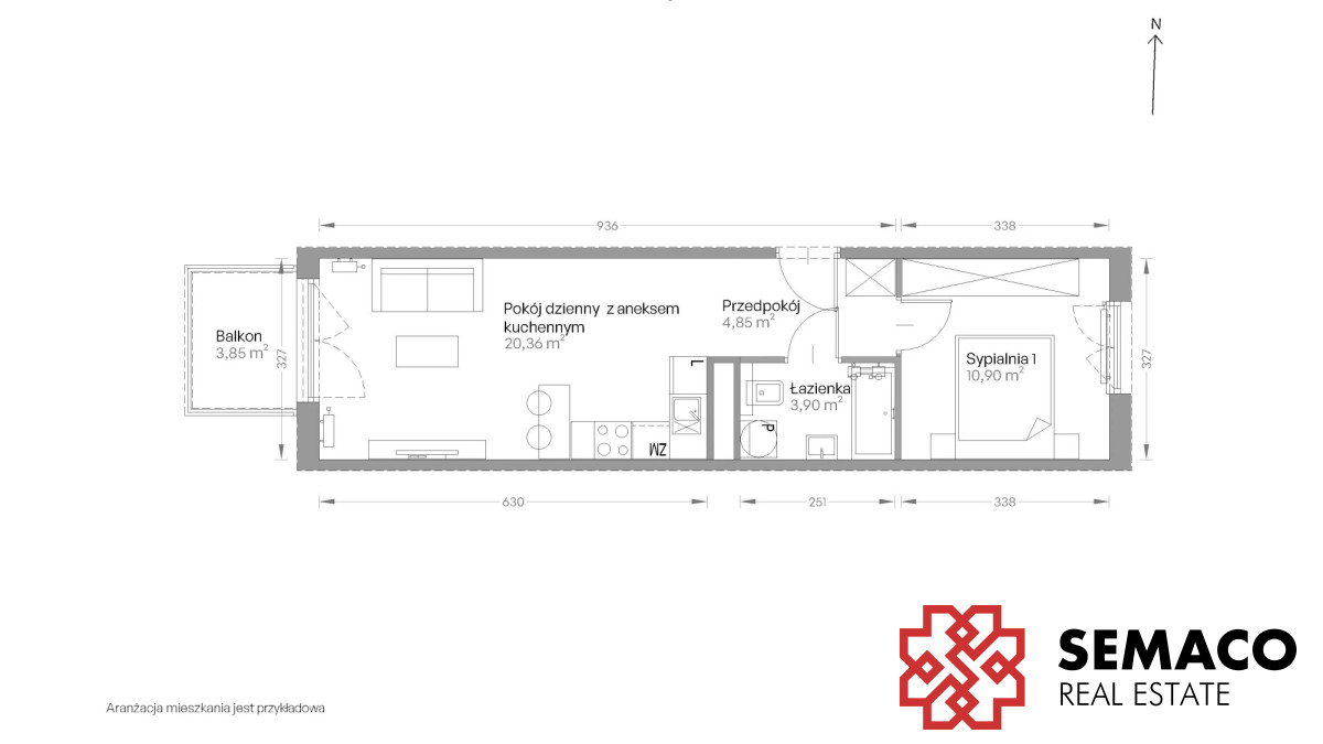 Układ: salon + aneks kuchenny, sypialnia, łazienka i przedpokój