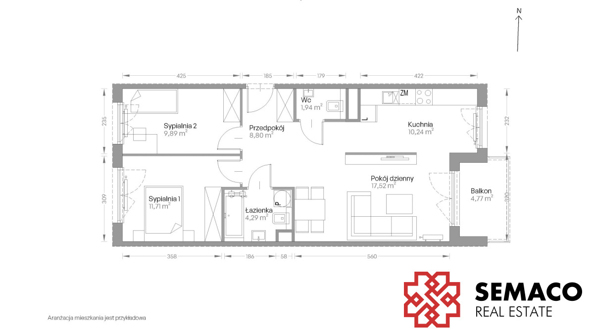 Układ: salon + aneks kuchenny, 2 sypialnie, łazienka, WC i przedpokój