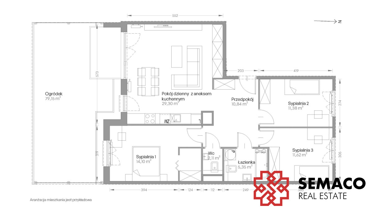 Układ: salon + aneks kuchenny, 3 sypialnie, łazienka, WC i przedpokój