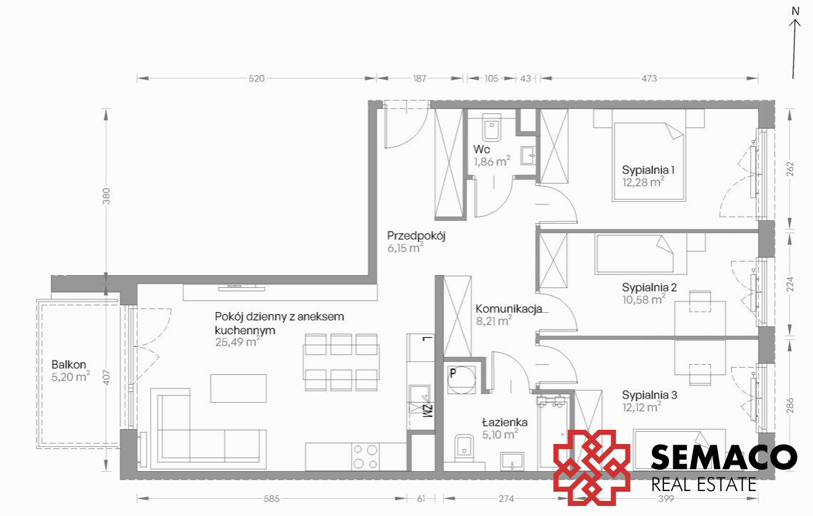 81.5m², 4 pokoje, balkon, 1 piętro.