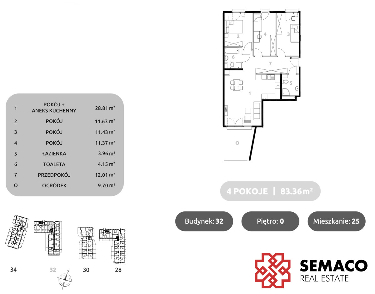 - 4 pokojowe: salon z aneksem kuchennym, 3 sypialnie, 2 łazienki i przedpokój