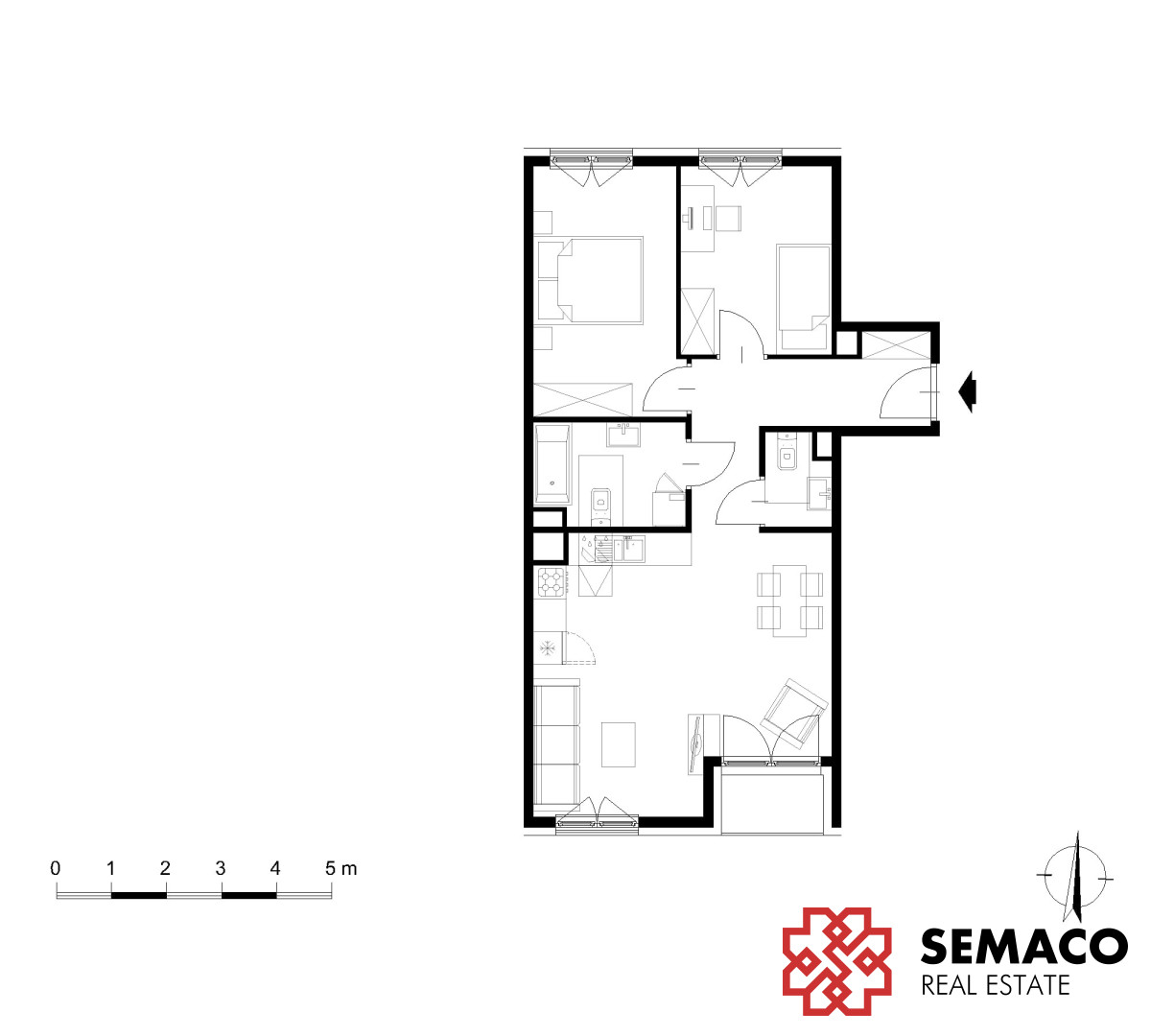 Układ: salon + aneks kuchenny, 2 sypialnie, łazienka, WC, przedpokój