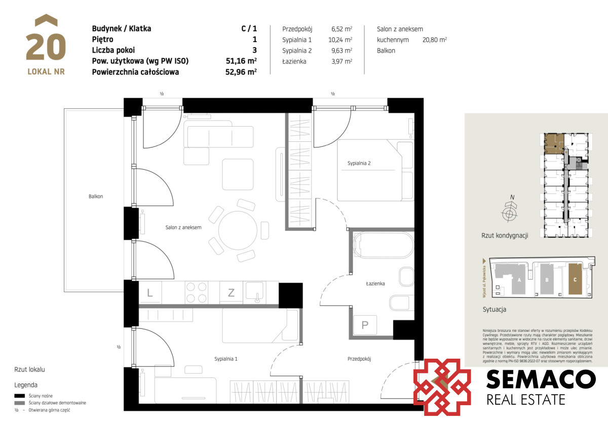 - Liczba pokoi: 3 (salon z aneksem, 2 sypialnie)