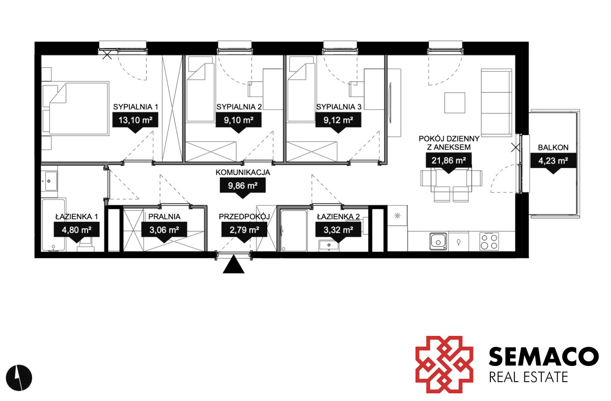 Układ: salon z aneksem kuchennym, 3 sypialnie, 2 łazienki, pralnia, przedpokój