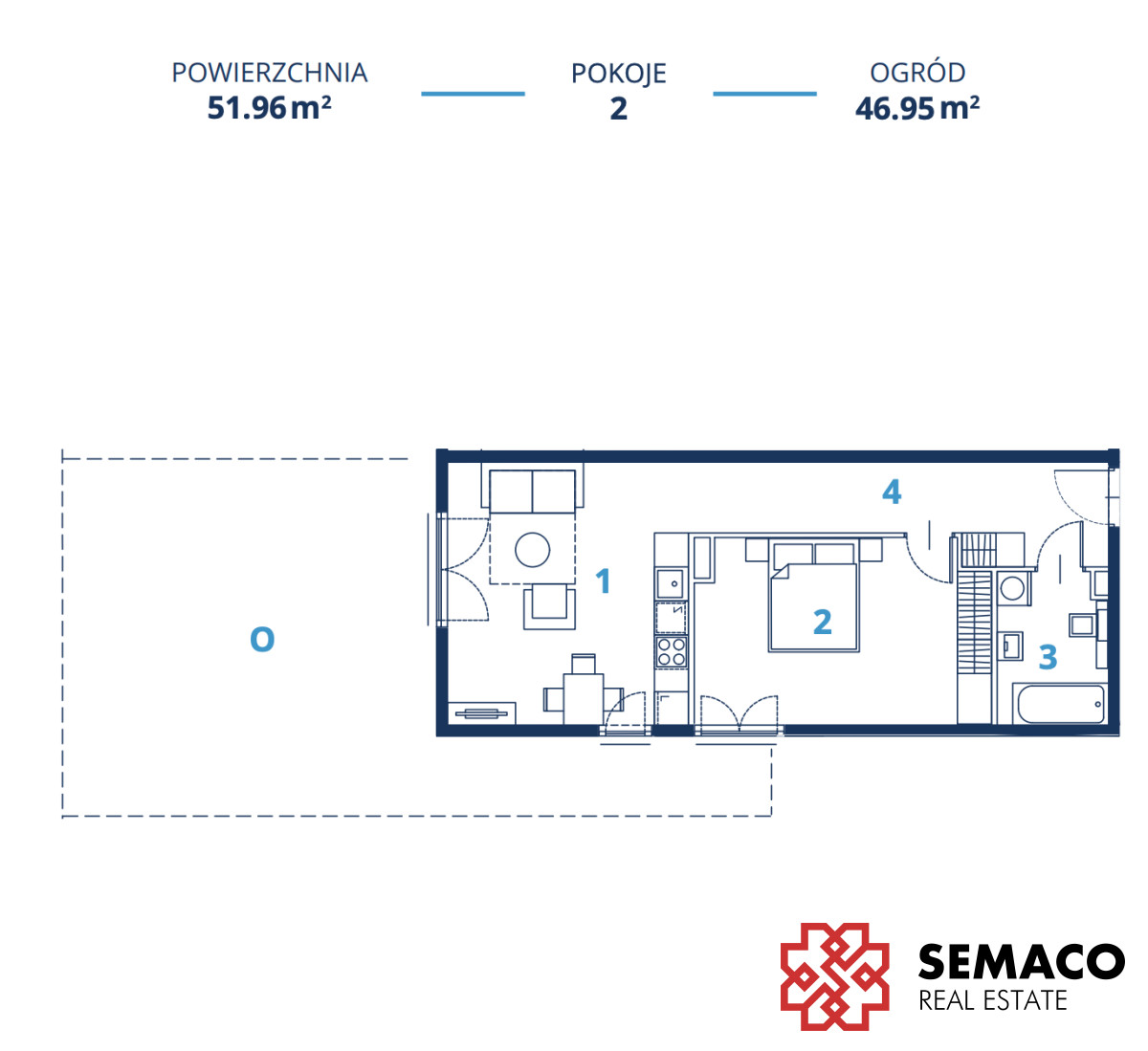 położone na parterze, z ekspozycją zachodnią o powierzchni 51,96 m2