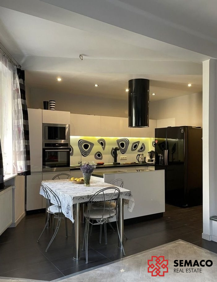 Salon z aneksem kuchennym i wyspą - w pełni wyposażony (płyta indukcyjna 4-palnikowa, piekarnik z funkcją mikrofali, zmywarka, lodówka side-by-side z kostkarką i dystrybutorem wody, okap).