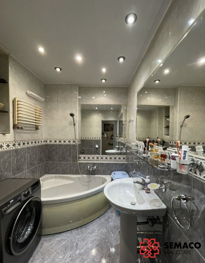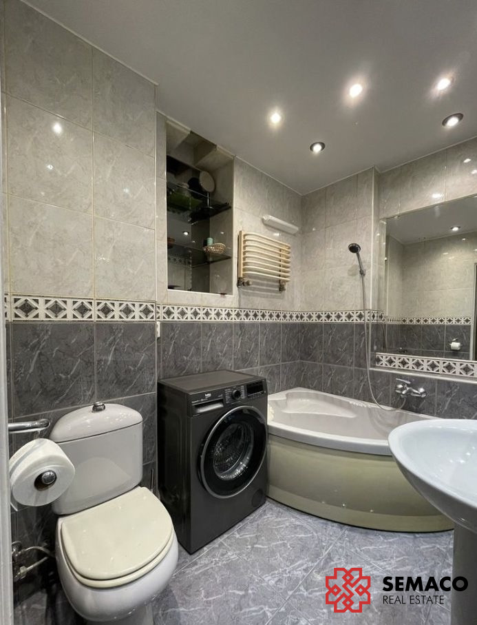 Łazienka z trójkątną wanną, toaletą oraz pralko-suszarką w zabudowie.