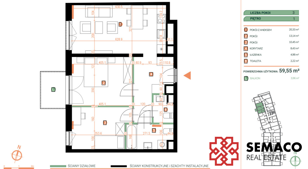 63,09 m2, 3 pokoje, 1 piętro, ul. Portowa, Zabłocie,