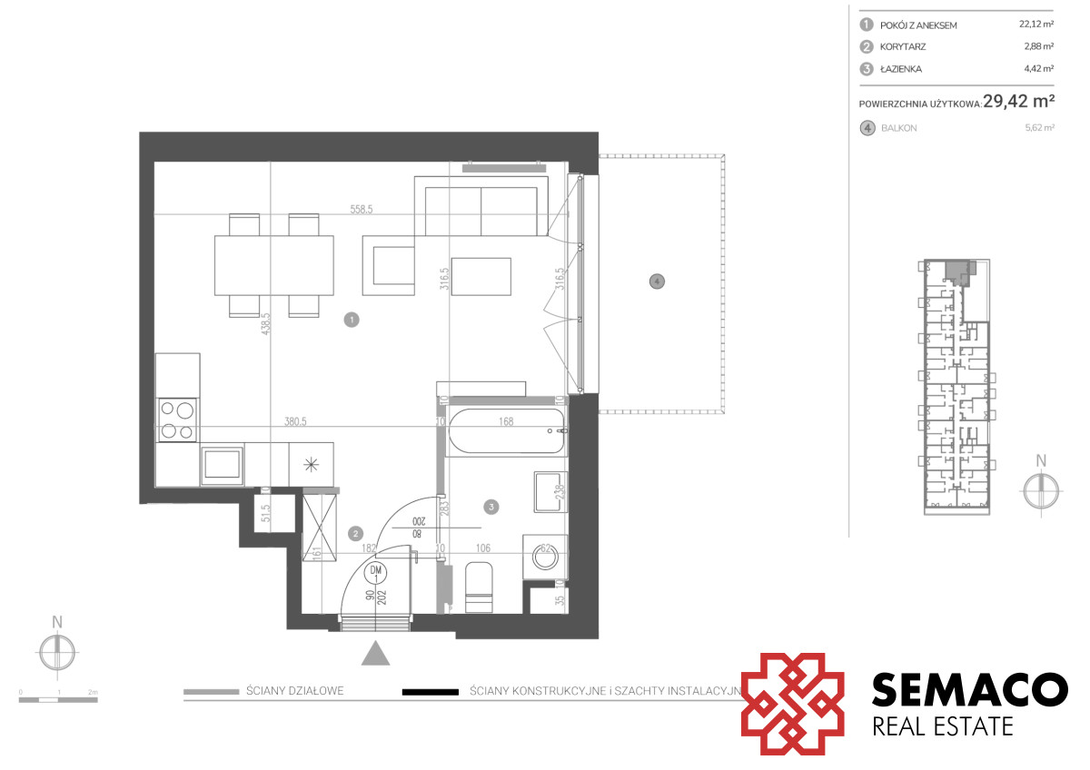 Mam przyjemność zaproponować Państwu mieszkanie w nowej inwestycji powstającej na Zabłociu. To 1 pokojowe mieszkanie o powierzchni 29,42 m2 położone jest na 4 piętrze w 7 piętrowym budynku z windą.