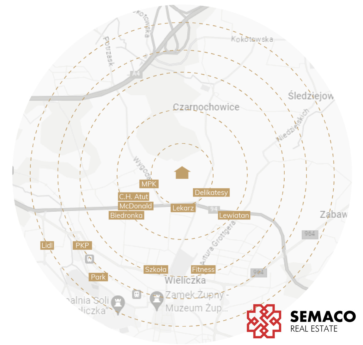 - osiedle zlokalizowane na granicy Krakowa i Wieliczki pośród zieleni i zabudowy jednorodzinnej