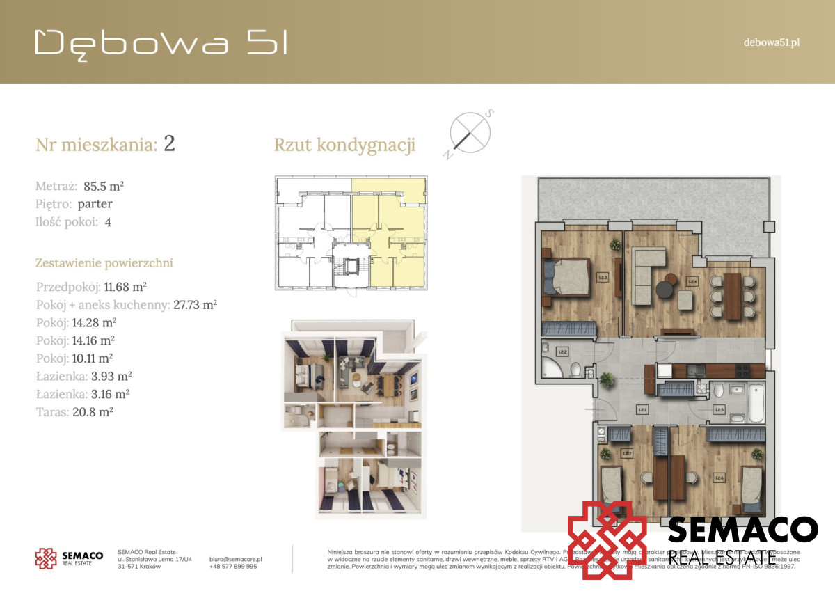 - salon z aneksem kuchennym, 3 sypialnie, 2 łazienki, przedpokój