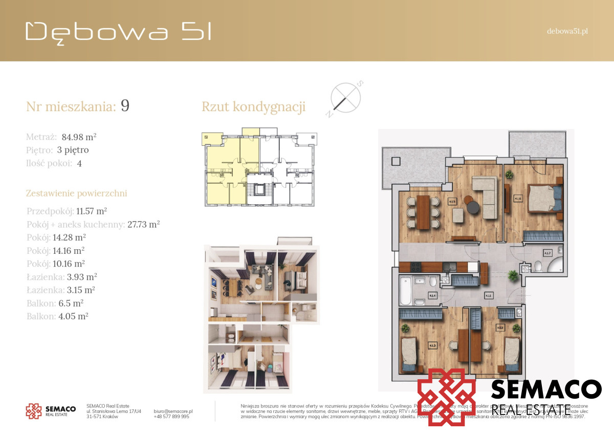 - salon z aneksem kuchennym, 3 sypialnie, 2 łazienki, przedpokój
