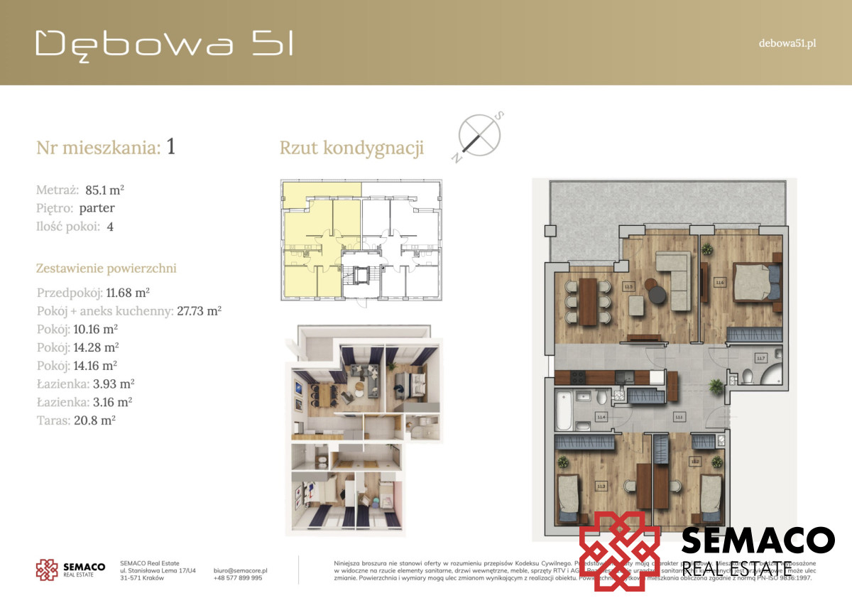 - salon z aneksem kuchennym, 3 sypialnie, 2 łazienki, przedpokój